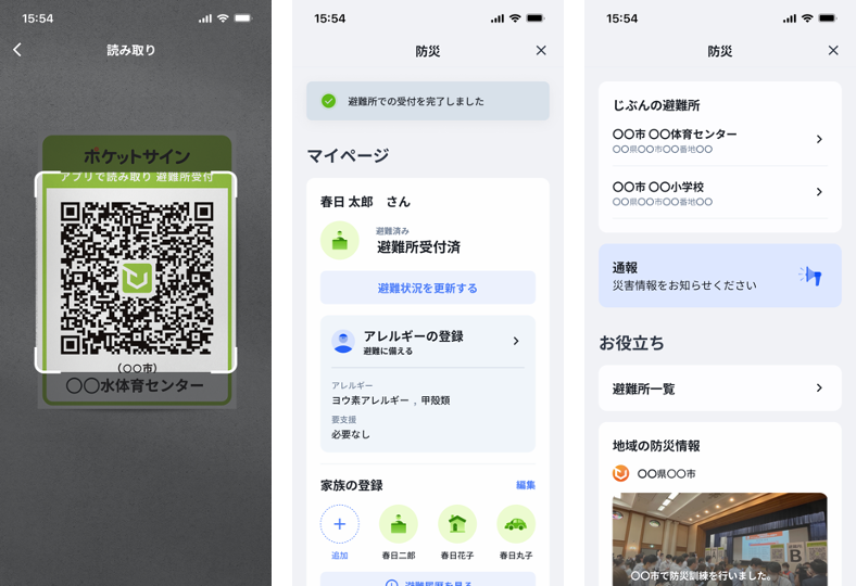 家族登録、アレルギー情報等の登録、プッシュ通知の受信、安否状況の応答・共有、問診票の回答、避難所二次元コード受付、避難所情報の確認など