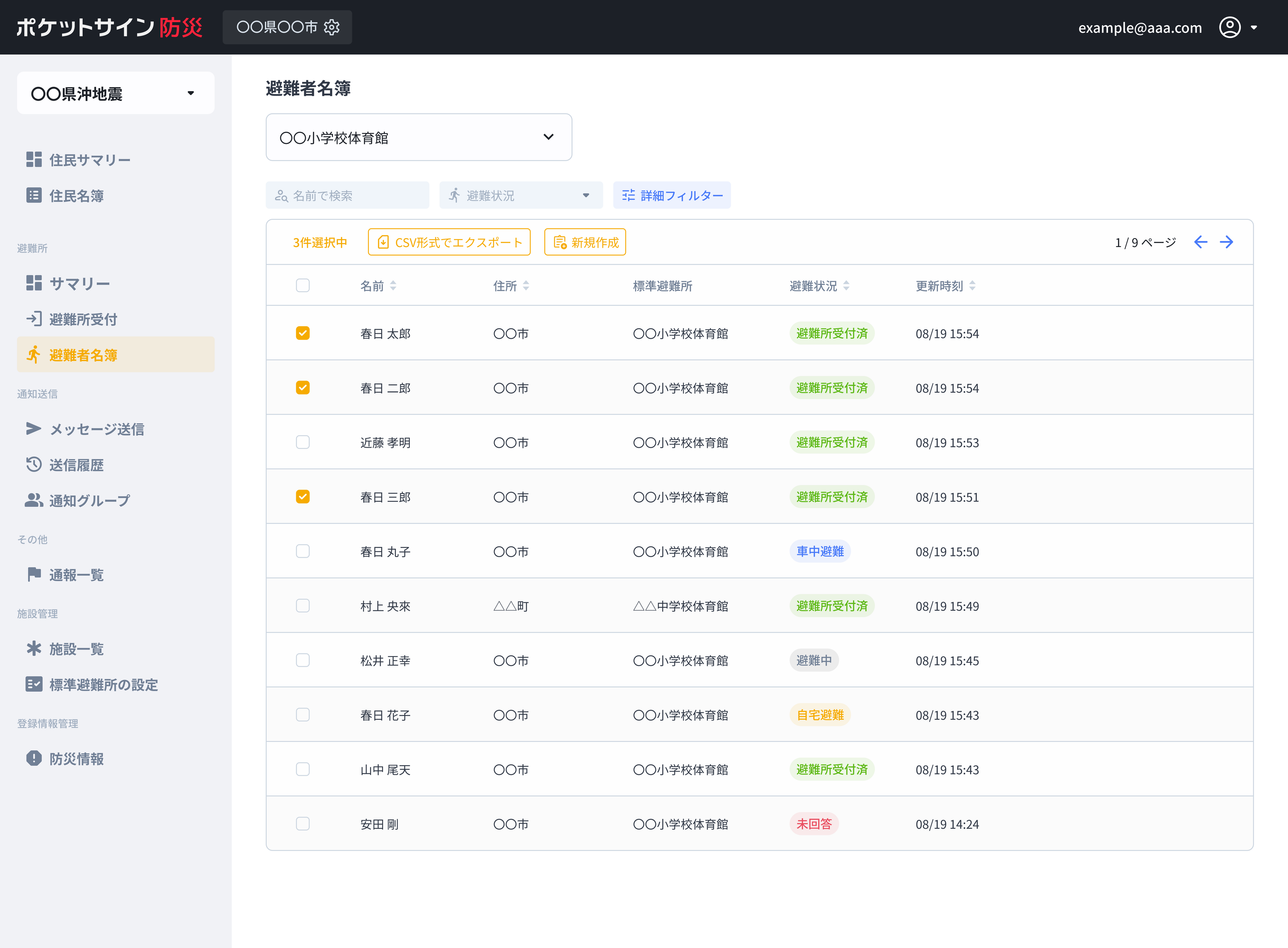 避難先案内のプッシュ通知、安否状況のリアルタイム把握、避難所の受付業務効率化、不足物資の調査など