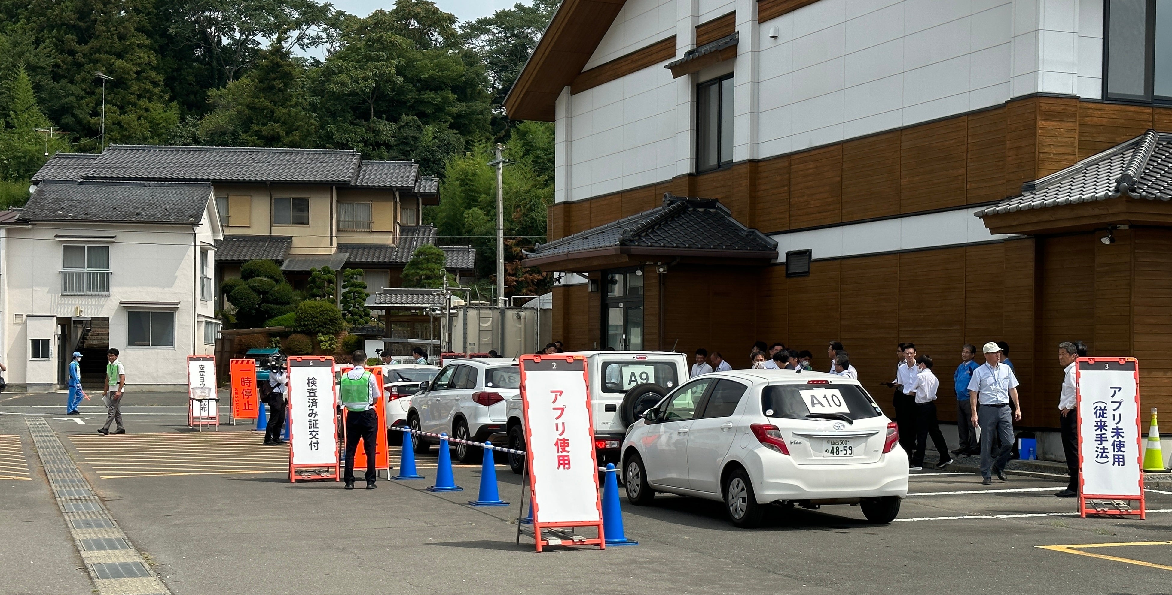 検査場での避難車両 10 台の通過にかかる時間がアプリ方式では約 9 分、従来手法では約 15 分となり、約 4 割の時間短縮を実現しました。また避難所においては、昨年度と同様に、アプリ方式では QR コード読み取りおよびアプリ上での事前の問診回答により待機なく瞬時にチェックインを完了できた一方、従来手法では住民が自治体職員に個別に氏名を伝え、さらに口頭で問診に回答する必要があったため、待機の列ができる結果となりました。