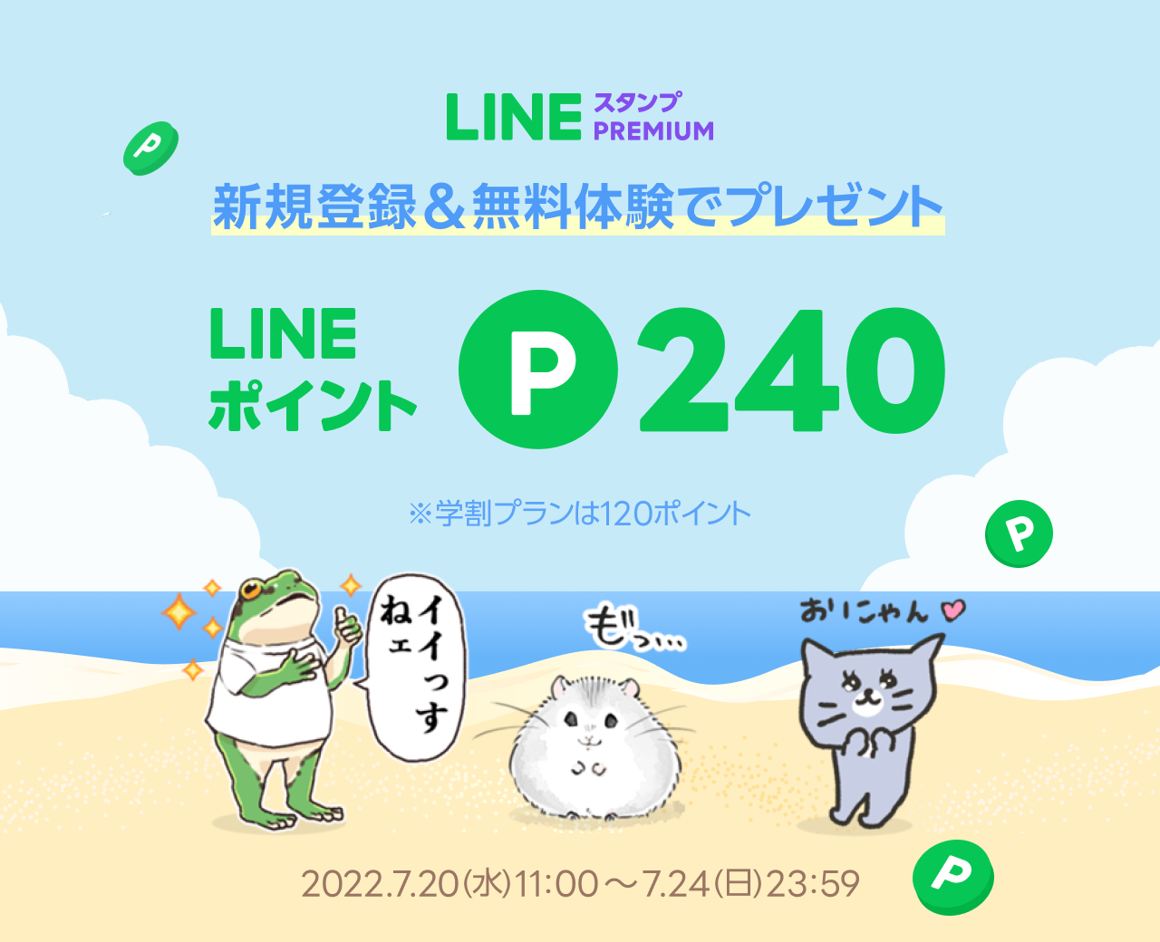 対象期間中に「LINEスタンプ プレミアム」を初回無料体験してくださった方全員に、LINEポイント最大240ポイントを付与いたします。