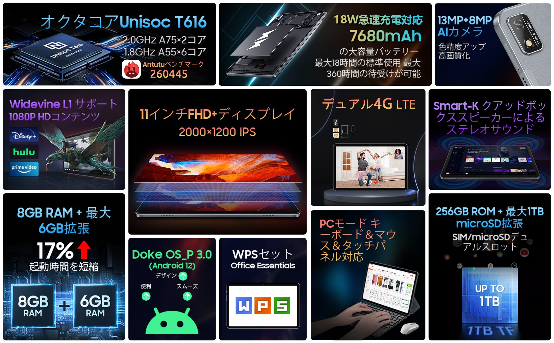 11インチ / Android 12 / 14GB(8GB+6GB拡張)RAM+256GB ROM+1TB 拡張 / FHD IPSディスプレイ / 4G LTE+WiFiモデル / Widevine L1対応 / GPS機能サポート / 3.5mmヘッドホンジャック