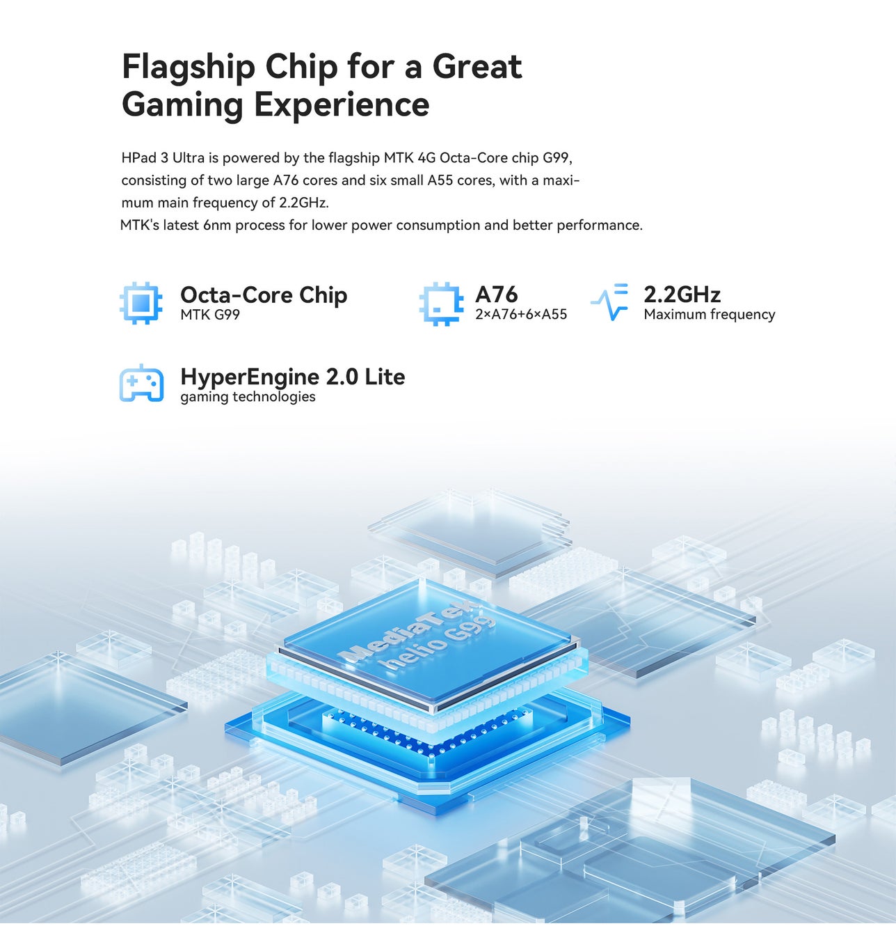 HeadwolfのハイエンドフラッグシップモデルであるHPad3 Ultraは、HPadシリーズの高性能を継承しており、MTK 4GオクタコアフラッグシップチップG99を採用しています。2つのA76ビッグコアと6つのA55リトルコアから構成され、最大クロック周波数は2.2GHzに達します。