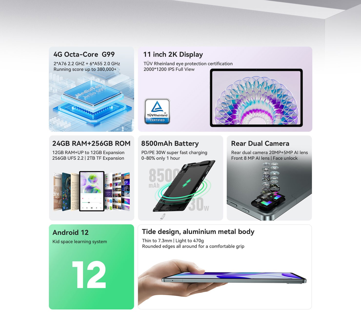 HPad3 Ultraは、11インチの超ナローベゼルディスプレイを採用し、通常の10インチのタブレットよりも多くのコンテンツを表示します。2000*1200の解像度、16:10のゴールデンディスプレイ比率、178度の広視野角IPS、360ニットの高輝度を備えており、映画、写真、ビデオの視聴を視覚的な楽しみにします。アルミ合金の金属ボディで、重量はわずか470gで、厚さはわずか7.3mmです。四方のラウンドエッジデザインで持ちやすく、持ち運びに便利です。