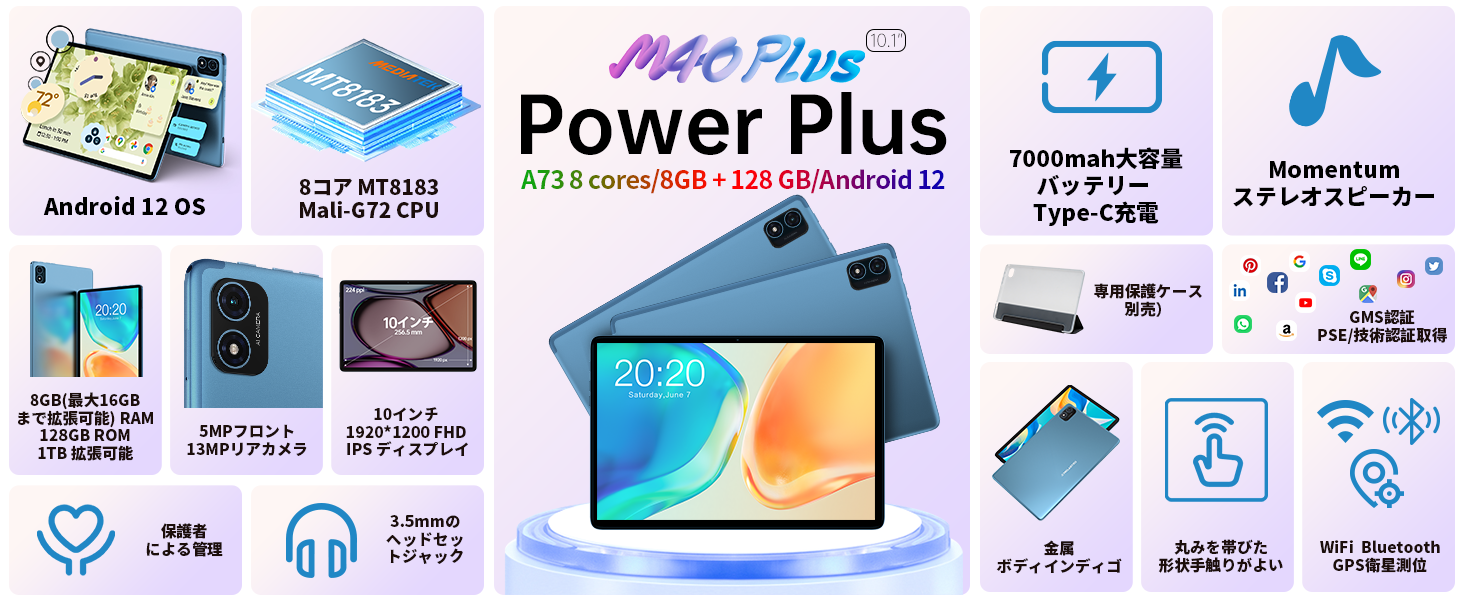 10インチ / Android 12 / 16GB(8+8GB拡張)RAM+128GB ROM+1TB拡張 / WIFIモデル / FHD IPSインセルディスプレイ / GPS機能サポート / 3.5mmヘッドフォンジャック