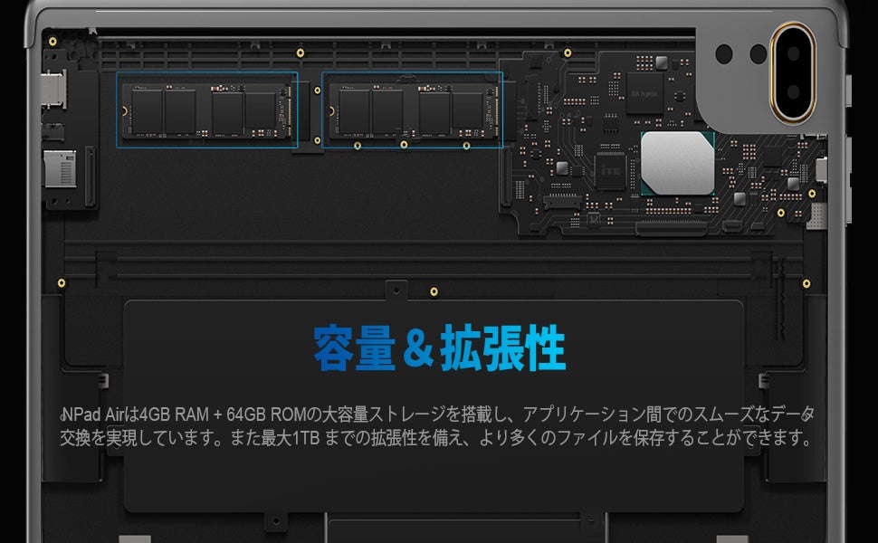 【大容量ストレージ+長寿命】NPad Airには8GB(4+4拡張)のRAMと64GBのROMが搭載されています。さらにMicroSDカードを使用してストレージを拡張することもできます。大容量のストレージには、ウェブサイトやビデオのスムーズな視聴、頑丈なアプリや高品質なゲームの楽しみが含まれます。最大6600mAhのバッテリーで最大6時間の連続再生が可能です。最大1TBのTFカードもサポートしており、さらなるストレージの拡張が可能です。