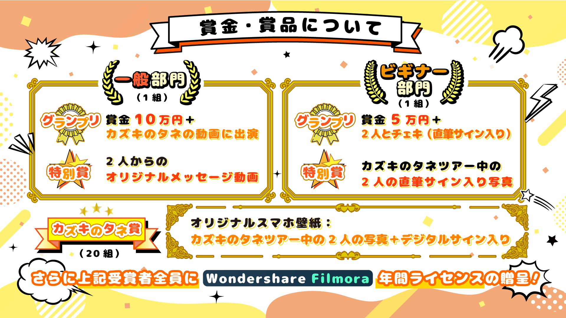 ■ 賞品:一般部門 グランプリ 1組 賞金10万円、カズキのタネへの出演