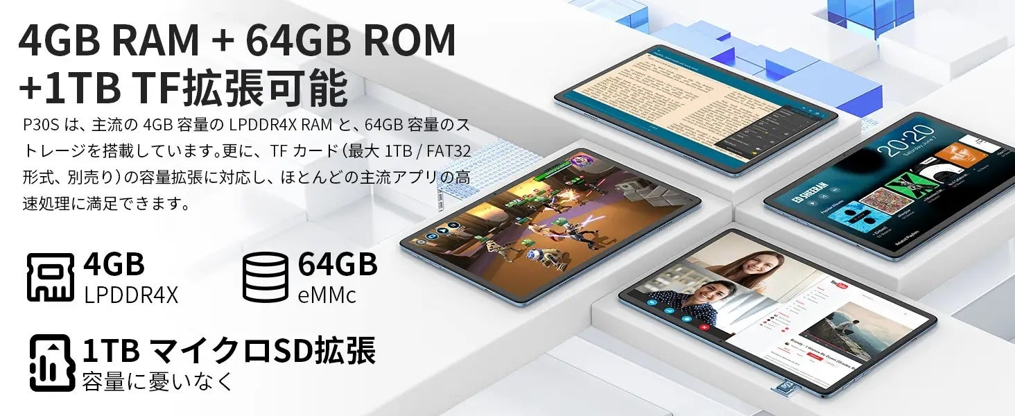 4GBメモリーと64GBのストレージで、好きな音楽、映画やより余裕に保存することができます。更に、TFカードの容量拡張に対応し、ほとんどの主流アプリの高速処理に満足できます。最大2.0GHzの周波数を持つ4つの高性能A73コア、およびMali-G72MP3マルチコアGPUを備えたMediaTek MT8183 8コアプロセッサを搭載して設計されています。 動画の視聴、音楽鑑賞など、スムーズでシームレスな体験を提供します。