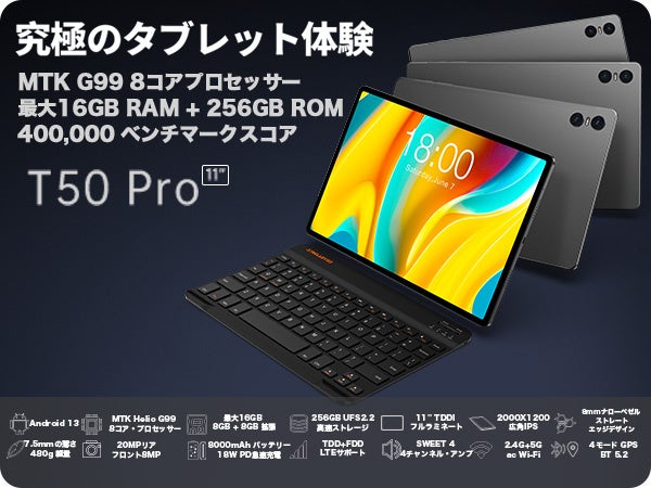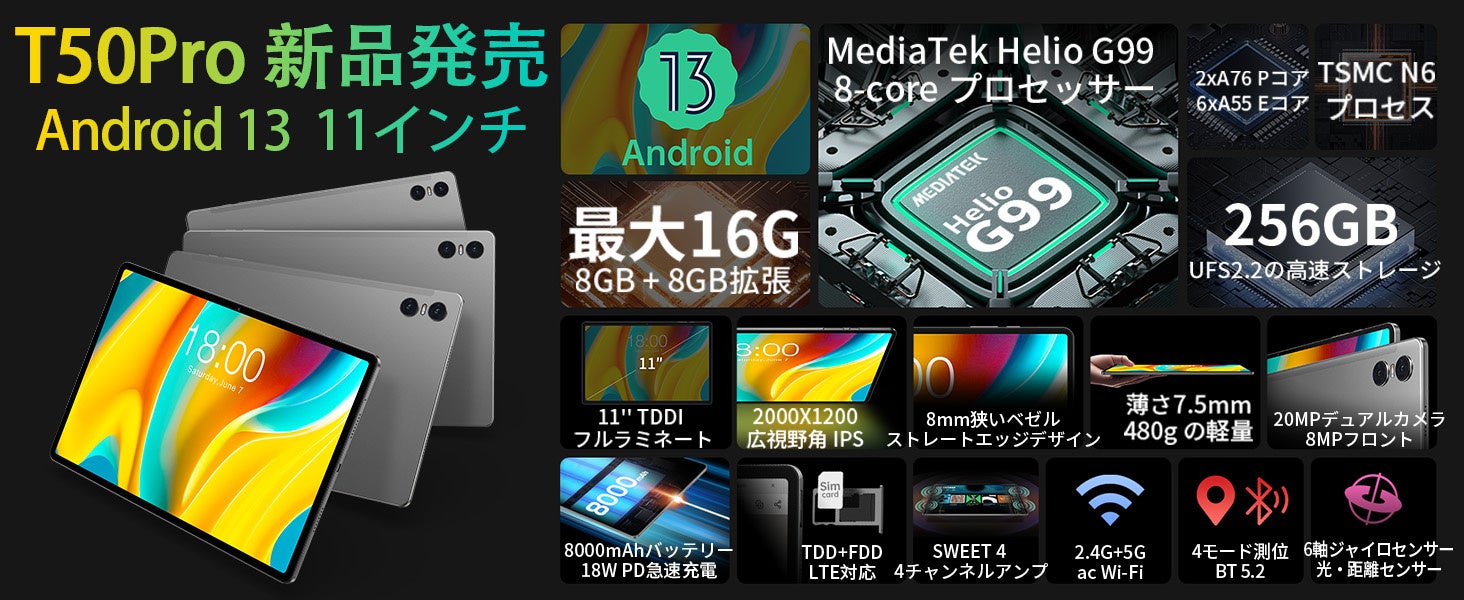 Helio G99搭載 / 11インチ / Android 13 / 16GB(8GB+8GB拡張)RAM+256GB / 2K FHD IPSディスプレイ / 8000mAh 18W PD快速充電 / 4モード衛星測位 / 4G LTE通話+WiFIモデル / 20MP+8MPカメラ
