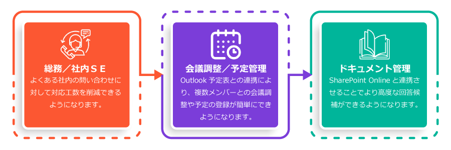 本サービスはユーザーとの自然な会話に対応できるAIチャットボットのソリューションになります。Microsoft TeamsやMicrosoft 365との連携により、ユーザー認証のシングルサインオン(SSO)やチャットボットを介したOutlookの予定表の操作(予定の参照、登録や他ユーザーとの会議調整等)が可能となり、Microsoft 365利用企業の社内DXの推進、業務の効率化に貢献致します。