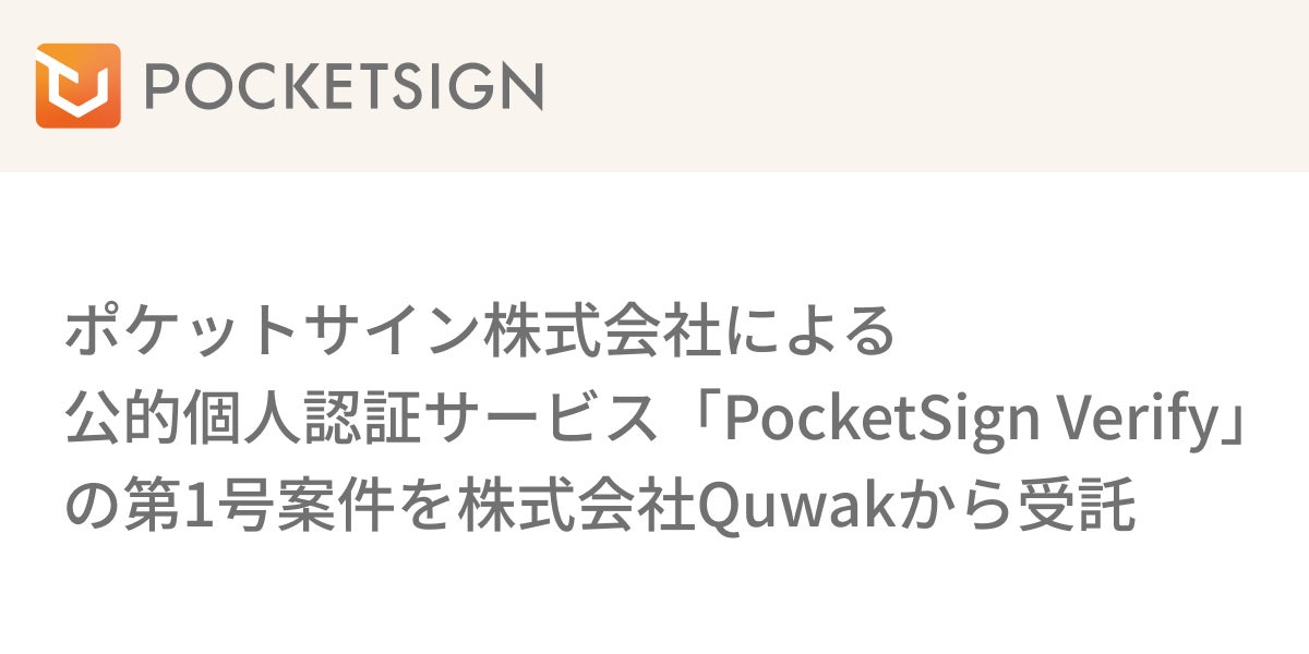 ポケットサイン株式会社による公的個人認証サービス「PocketSign Verify」の第1号案件を株式会社Quwakから受託しました