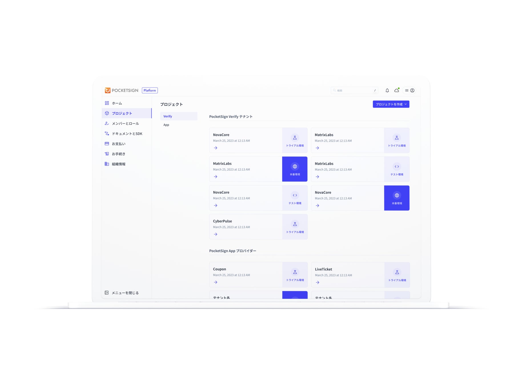 マイナンバーカードを活用するデジタル身分証スマートフォンアプリ「ポケットサイン」の開発のほか、マイナンバーカードに基づくオンライン本人確認である「公的個人認証サービス(JPKI)」を、自社アプリ等に手軽に組み込むための開発者向けプラットフォーム「PocketSign Platform/Verify(β 版)」を提供しています。