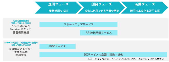 その第一弾※1として、製薬およびヘルスケア業界のお客様向けに従来より提供している統計解析や機械学習/自然言語処理を用いたサービス「Medical Drive」と組み合わせた、大規模言語モデル・生成AIのPoCや開発の支援を行います。