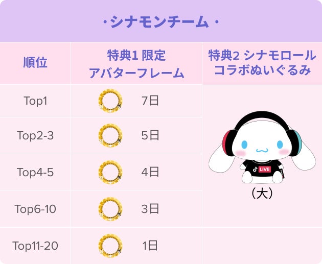 イベント期間中、サンリオキャラクターズとのコラボLIVEギフトを5種類リリースし、本イベントの上位入賞者には、シナモロールコラボぬいぐるみや、毎日デザインが変わるTikTok LIVEのプロフィールを装飾するアプリ内コラボアイテムがなどの豪華特典を贈呈します。さらに、今回はクリエイターと視聴者向けにデイリーミッションを追加!ミッション達成者には毎日抽選でクリエイターと視聴者それぞれ5名ずつにサンリオキャラクターズ人気グッズをプレゼント‼︎