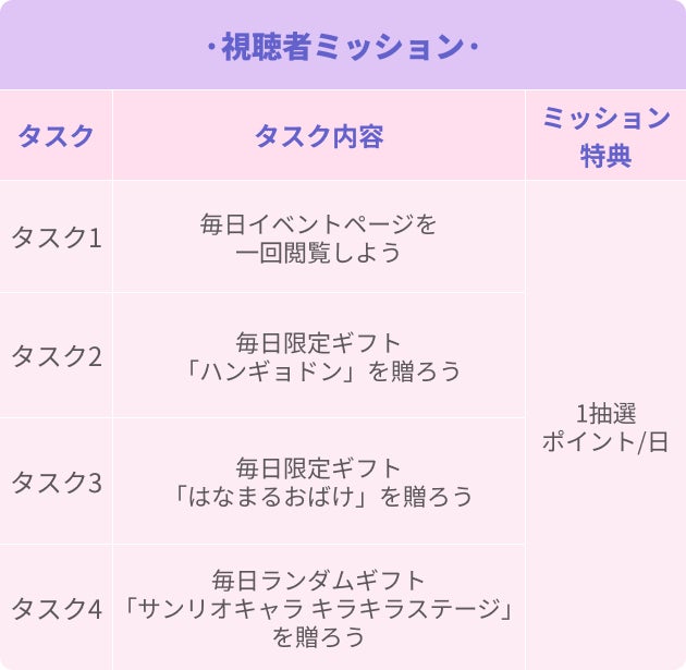 クリエイター・視聴者は、毎日それぞれのミッションを全てクリアすると1抽選ポイントが獲得でき、ご自身のイベントページ「デイリーミッション抽選」より抽選いただけます。