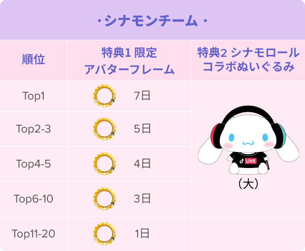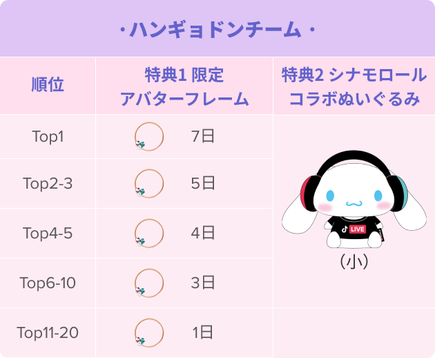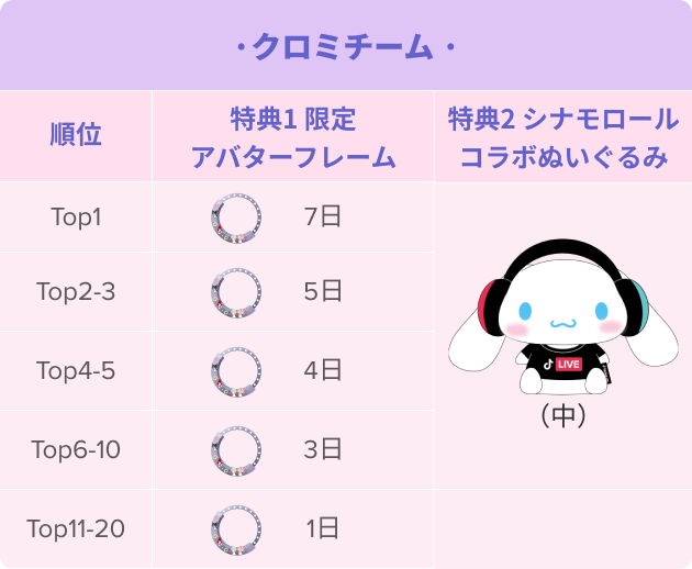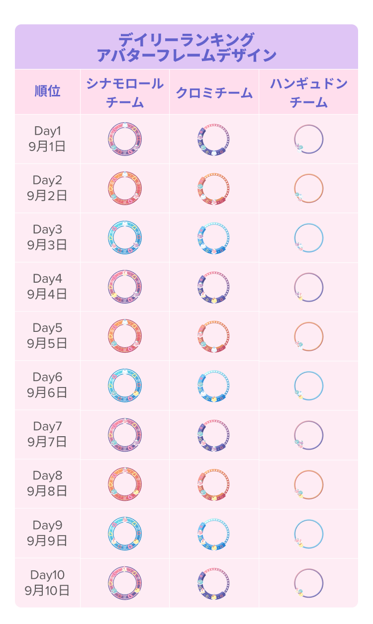 ●チーム分け:過去30日間に受け取ったダイヤモンド数に応じて、クリエイターは3つのグループ(シナモロールチーム/クロミチーム/ハンギョドンチーム)に分けられます。