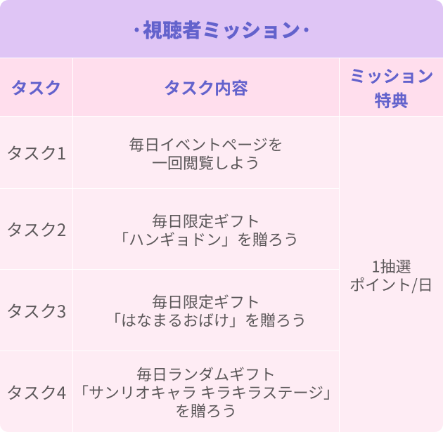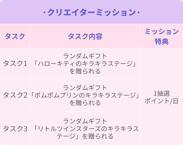 クリエイター・視聴者は、毎日それぞれのミッションを全てクリアすると1抽選ポイントが獲得でき、ご自身のイベントページ「デイリーミッション抽選」より抽選いただけます。