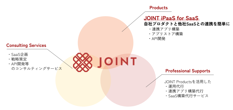 「全てのDataと企業をJointする存在に」というVisionと「SaaSのチカラを全ての企業に」というMissionを掲げ、SaaSの活用・価値向上を進めるうえで課題となる穴を埋める存在としてSaaS事業者向けシステムの開発や、SaaS連携アプリストアの運営、および、SaaS導入コンサルティング事業を展開しております。