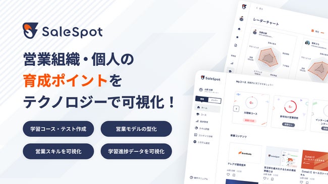 「SaleSpot」は、2023年6月にローンチした営業組織・個人の育成ポイントの可視化、営業成果の向上を支援するDXツールです。個々人の理解度に合わせた学習コンテンツの提供により、属人化している営業ノウハウを効率的に組織内に浸透させ、高品質で安定的な人材育成が可能となります。