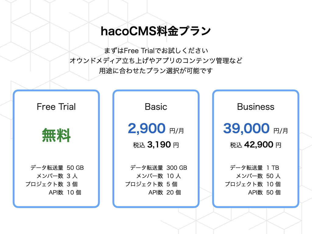 「hacoCMS」はこれまでクローズドベータ版として多数のプロジェクトへの導入を通じて、機能拡充を行ってまいりました。この度、正式版リリースではどなたでも簡単にヘッドレスCMSを利用できるサービスとして、無料プランを含む複数のプランをご用意しています。