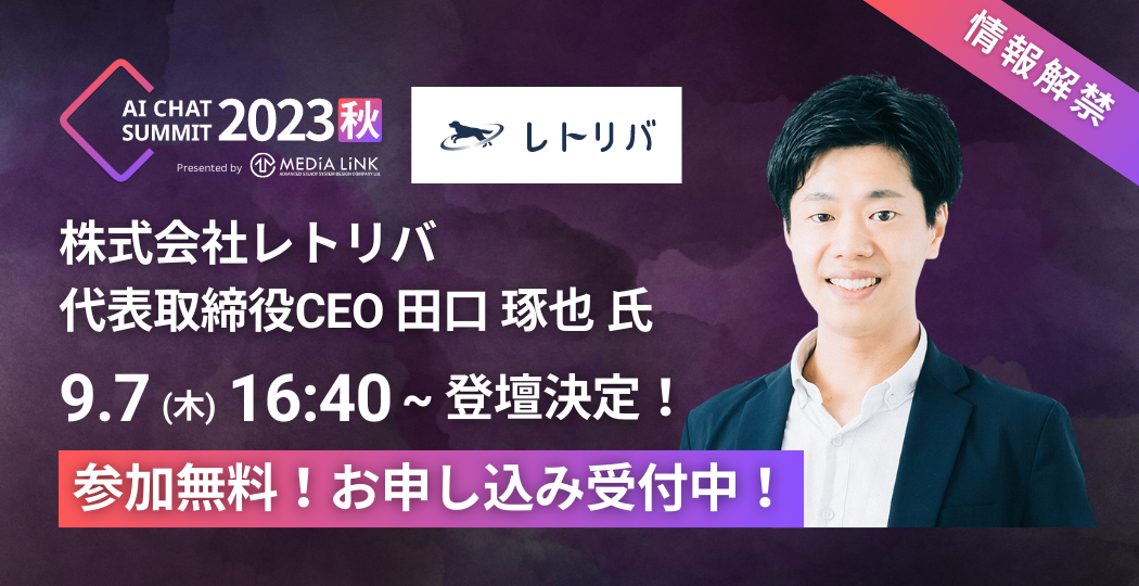 ChatGPTの登場以降もAIは休むことなく日々進化し、私たちの日常とビジネスの両方に浸透しはじめています。もはやAIが無い未来を考えることは難しく、我々はAIと共に歩む道を本気で考える時代に突入しています。そんな未来について、AIチャットボットやAI関連技術に心を燃やす多種多様な専門家と一緒に考える1日。それが『AI CHAT SUMMIT2023秋』です。AIの進化の波に乗り、AIと共創する未来へ。