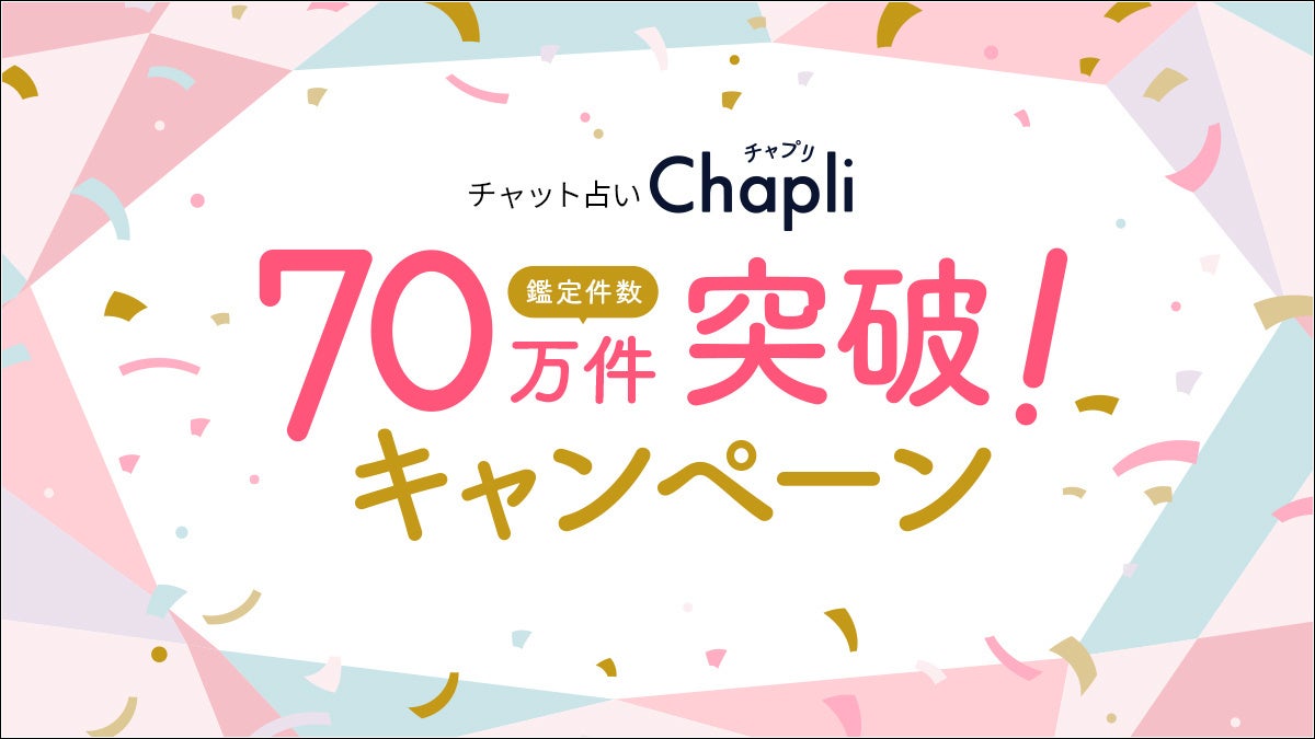 たくさんの方にご利用いただき、鑑定件数70万件を突破することができました! 昨今では、AIが進化し、色んな分野で私たちの暮らしを便利にしてくれています。 しかし、眠れないような不安な気持ちや、叶えたい想いに寄り添うことについては、AIが人と人のコミュニケーションを超えることはないと考えています。『Chapli』では、不安なとき背中を押してくれる占い師さんがいつでもお待ちしています。 今後とも『Chapli』をどうぞよろしくお願いいたします! |