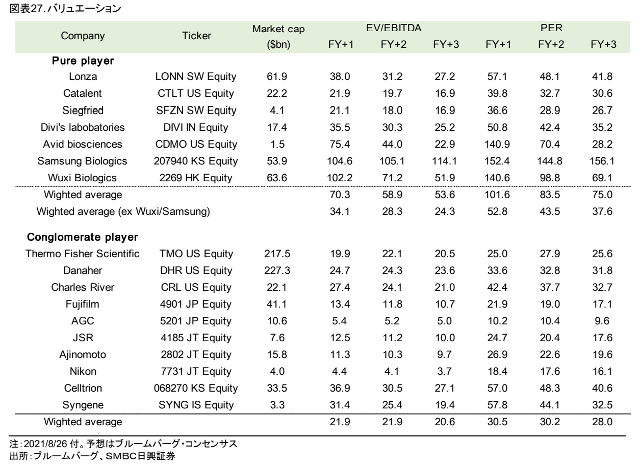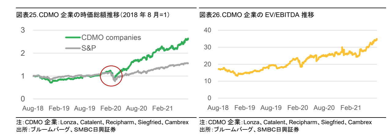 たとえば、SMBC日興証券のレポート(https://researchdirect.smbcnikko.co.jp/pdf/front_pdf_download.php?reportid=184658-1&u=20978)によれば、上場CDMO企業の株価パフォーマンスは極めて高く推移し、特に、アジアのpure CDMO企業への評価が高く(EV/EBITDAでx100以上水準)推移しています。