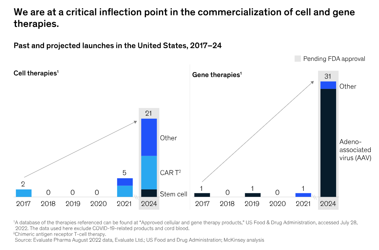 McKinsey and Company社の2021年のレポート(https://www.mckinsey.com/industries/life-sciences/our-insights/eight-imperatives-for-launching-cell-and-gene-therapies)によると、現在(2021~24)は”infrection point(変曲点)”として、今後一気に多数のCGT製品の上市が進む=産業化が進むことが期待されています。