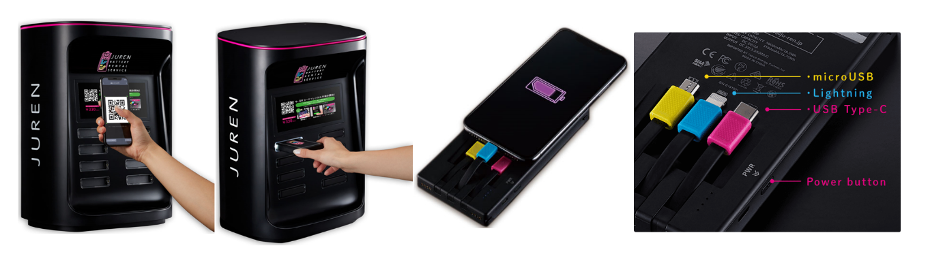 鉄道や商業施設などの公共エリアを中心に、現在、全国各地の約3,000箇所にレンタルスタンドを設置。一台330円(税込)で、レンタル当日から翌日24時まで利用可能で「充レン」のレンタルスタンドであれば、どこでも返却可能。3種類の接続端子を装備しており、様々な端末に対応可能。
