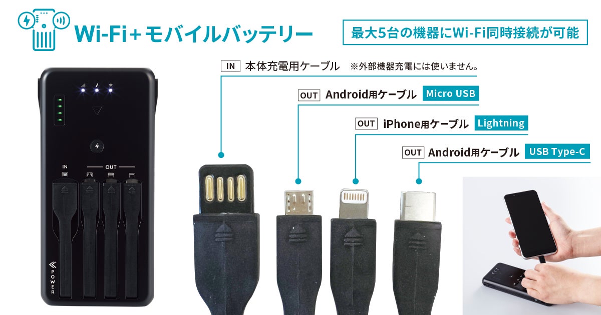 本体充電用のUSBケーブルに加え、スマートフォンの充電用に3タイプのケーブルを内蔵。モバイルバッテリーとしても使用可能。