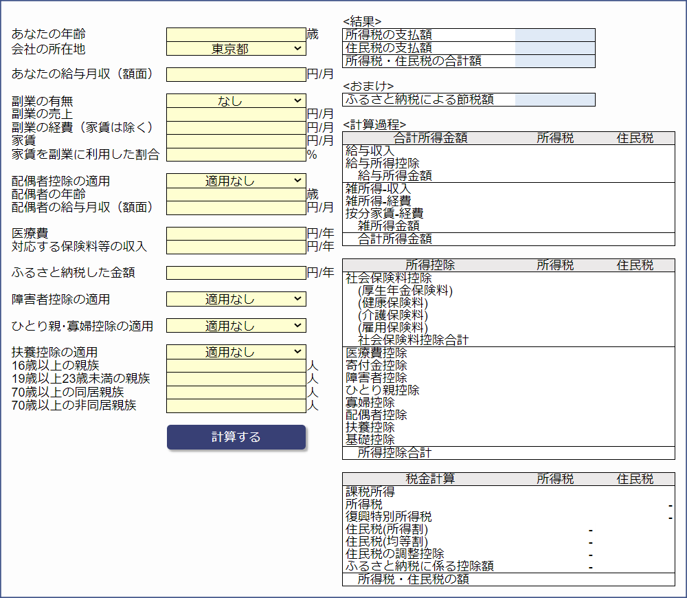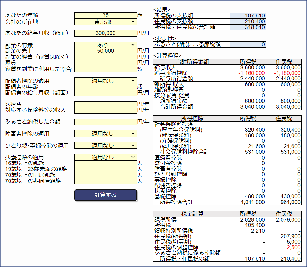 既存の公開されているツールよりも厳密な計算が可能であり、「会社員の副業」や「ふるさと納税による控除」など、細かな計算にも対応しています。