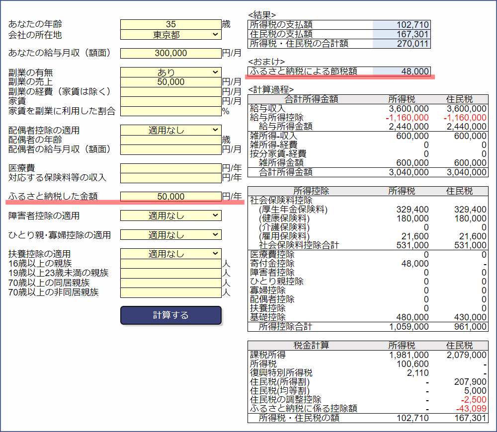 試しに、前掲の条件に加えて「ふるさと納税した金額」に50,000円を入力してみます。