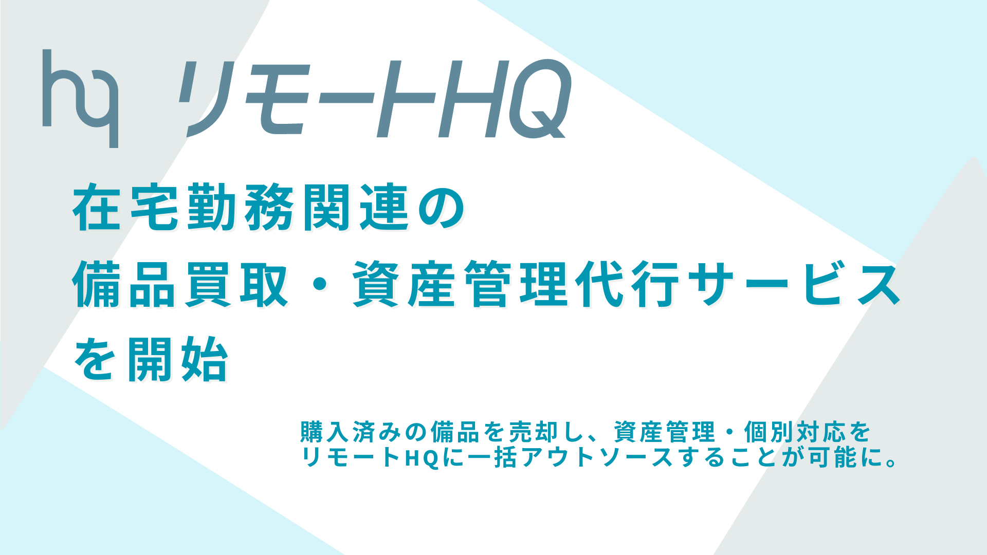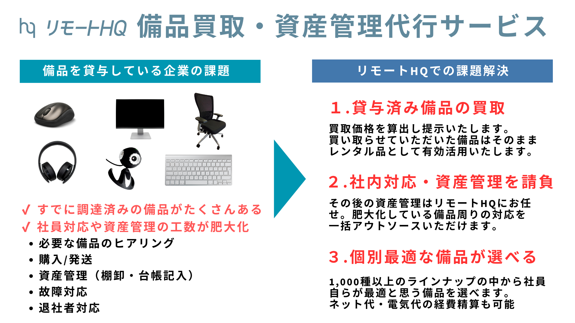 そこで、既に備品を購入し貸与されている企業様向けに、新しく「在宅勤務関連の備品買取・資産管理代行サービス」をスタートいたしました。備品はリモートHQで買い取り、その後はリモートHQに資産管理・社員様の個別対応などの管理工数をアウトソースできます。