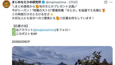 まじめなえひめ研究所(愛媛県松山市本町6丁目7-4・代表秋山真哉・)が運営している、まじめえひめ公式X『まじめ課長のまじめなつぶやき日記』()で愛媛県のグッズや産品をフォロワーに向けてプレゼントするキャンペーンを毎月実施しています。3月は...